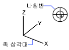 십자선을 이동함에 따라 축 삼각대가 나침반에서 지시되는 뷰 방향에 따라 회전합니다. 뷰 방향을 선택하려면 좌표 입력 장치를 구체 위의 위치로 이동한 다음 클릭하십시오.