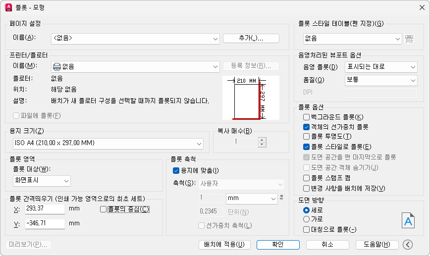 도면에서 플롯할 부분을 지정합니다. 플롯 대상에서 플롯될 도면의 영역을 선택할 수 있습니다.