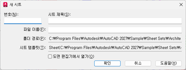 시트 번호를 지정합니다. 처음 시트를 작성할 때 시트 번호를 채우지 않는 것이 좋습니다. 기본적으로 새 시트의 도면 이름 및 배치 이름은 시트 제목을 가진 시트 번호입니다.