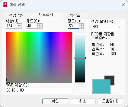 색상을 선택하려면 RGB 색상 모델을 지정합니다. 트루컬러 탭의 옵션은 HSL 또는 RGB 색상 모델 중 어떤 모델이 지정되었는지에 따라 다릅니다.