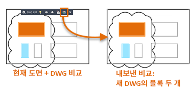 DWG 비교 도구막대를 사용하여, 비교 도면에서 현재 도면으로 차이점을 가져올 수 있습니다. 비교 도면에서 차이점이 있는 객체만 현재 도면으로 가져올 수 있습니다.