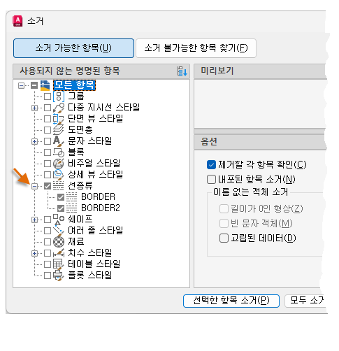 - 참조되지 않은 선종류를 모두 소거하려면 선종류를 선택합니다.