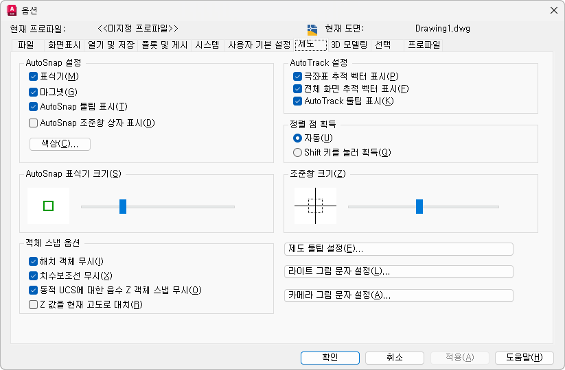AutoSnap 표식기의 표시를 조정합니다. 이 표식기는 십자선을 스냅점 위로 가져 가면 표시되는 기하학적 기호입니다. (AUTOSNAP 시스템 변수)