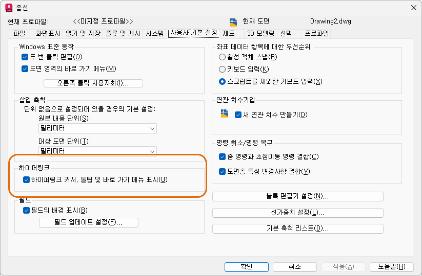 옵션 대화상자의 사용자 기본 설정 탭에서 하이퍼링크 정보 표시를 사용하도록 설정합니다.