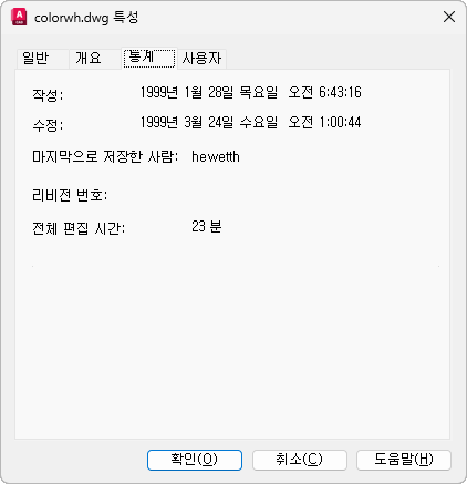 도면의 편집에 걸린 전체 시간을 표시합니다. 이 값은 TDINDWG 시스템 변수에 저장됩니다.