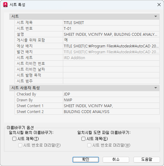 선택한 시트의 특성을 표시합니다. 또한 사용자 특성을 표시합니다(있는 경우). 새 값을 입력하여 시트 특성을 수정할 수 있습니다. 예상 배치는 시트가 저장된 도면의 경로 및 파일 이름입니다. 발견 배치는 시트가 발견된 도면의 경로 및 파일 이름입니다. 경로가 다른 경우 예상 배치에서 경로 및 파일 이름을 수정할 수 있습니다. 이 작업은 시트를 시트 세트와 다시 연관시킵니다.