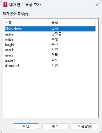 블록 특성 테이블에 추가할 수 있는 매개변수의 이름을 표시합니다.