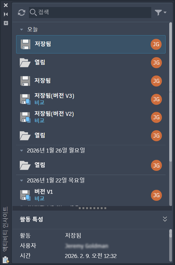 액티비티 인사이트는 각 참가자의 도면 파일 업데이트를 기록하므로 공동작업이 간소화되고 중단한 지점을 선택할 수 있습니다.