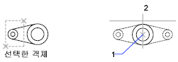 지정한 두 개의 점이 선택한 객체가 대칭되는 기준선의 양 끝점이 됩니다. 3D의 대칭에서 이 선은 대칭선이 포함된 사용자 좌표계(UCS)의 XY 평면에 직교인 대칭 평면을 정의합니다.