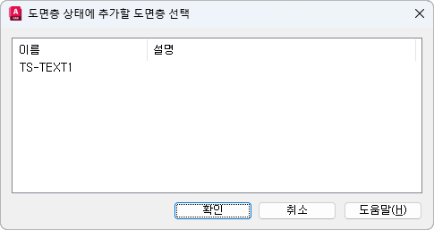도면층 상태에 추가되지 않은 도면층의 이름 및 설명을 표시합니다. 추가할 도면층을 선택하고 확인을 클릭합니다.