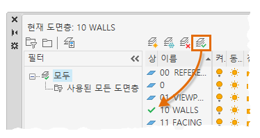 모든 새 객체는 기본적으로 현재 도면층에 그려집니다. 도면층 특성 관리자에서 초록색 선택 표식은 현재 도면층을 나타냅니다.
