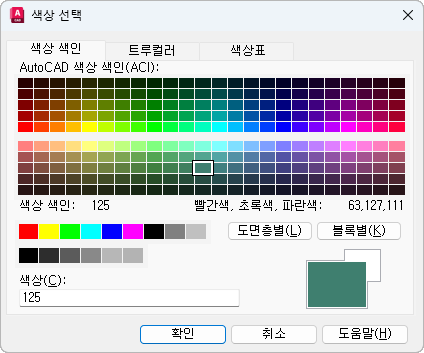 AutoCAD 색상 색인(ACI)에서 세 개의 탭에 있는 255개의 색상, 트루컬러, 색상표 중에서 선택할 수 있습니다.