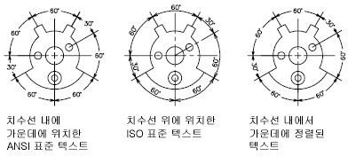 문자 정렬 같은 기타 설정은 문자의 수직 정렬에 영향을 줍니다. 예를 들어, 위에서 맨 왼쪽 그림에서와 같이 수평 정렬을 선택하면 치수보조선 내부의 문자와 치수 선 내부의 중심에 배치된 문자가 수평으로 정렬됩니다. 치수 선이 수평이 아니라도 문자는 수평으로 정렬됩니다.