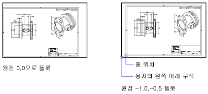 플롯 간격띄우기는 용지 모서리 또는 인쇄 가능 영역의 왼쪽 아래 구석(원점)을 기준으로 하는 플롯 영역의 간격띄우기를 지정합니다.
