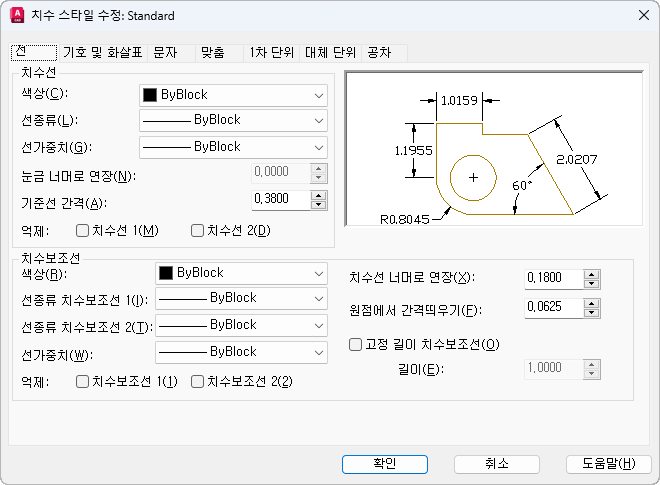 선 탭(치수 스타일 관리자)