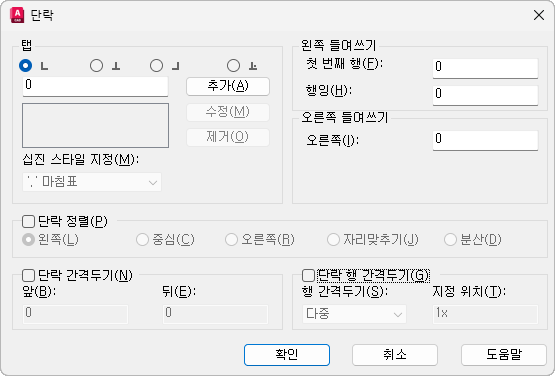 첫 번째 행의 들여쓰기 값 또는 선택한 단락이나 현재 단락의 들여쓰기를 설정합니다.