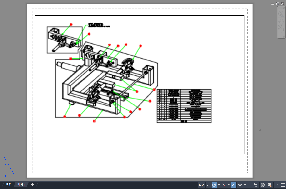 - 인쇄할 도면을 준비하려면 도면 공간으로 전환합니다. 이 공간에서 제목 블록과 주를 사용하여 서로 다른 배치를 설정할 수 있으며, 각 배치에서는 서로 다른 모형 공간 뷰를 표시하는 배치 뷰포트를 작성할 수 있습니다. 배치 뷰포트에서는 도면 공간을 기준으로 모형 공간 뷰를 축척합니다. 도면 공간의 한 단위는 용지에서 실제 거리(페이지 설정을 구성한 방법에 따라 밀리미터 또는 인치)를 나타냅니다.