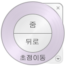 이 휠을 사용하여 기본 2D 탐색 도구에 액세스할 수 있습니다. 이 휠은 스크롤 휠이 포함된 좌표 입력 장치를 사용하고 있지 않은 경우 특히 유용합니다. 이 휠에는 초점이동 및 줌 도구가 포함되어 있습니다.