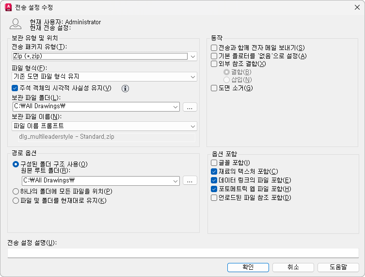 이 필드를 변경하지 않고 그대로 둘 경우, 전송 파일은 첫 번째 지정된 도면 파일이 들어 있는 폴더에 작성됩니다. 시트 세트 환경에서 전송 파일은 시트 세트 데이터(DST) 파일이 들어 있는 폴더에 작성됩니다. AutoCAD LT에는 해당되지 않습니다.