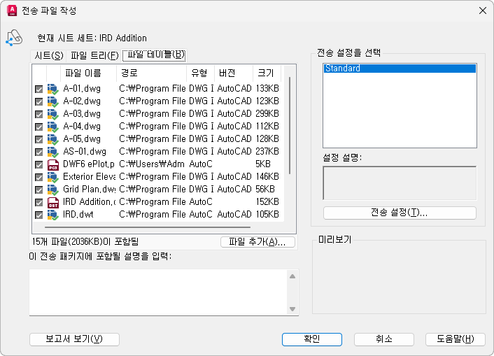기본적으로 현재 도면과 연관된 모든 파일(예: 관련된 외부 참조, 플롯 스타일 및 글꼴)이 나열됩니다. 전송 패키지에 파일을 추가하거나 기존 파일을 제거할 수 있습니다. URL로 참조된 관련 파일은 전송 패키지에 포함되지 않습니다.