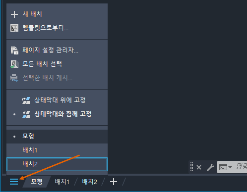 - 여러 배치 탭을 표시하기 위해 추가 공간을 확보하려는 경우 모형 또는 배치 탭을 마우스 오른쪽 버튼으로 클릭하고 상태막대 위에 고정을 선택할 수 있습니다. 모형 및 배치 탭은 상태막대 위에 별도의 행에 표시됩니다.