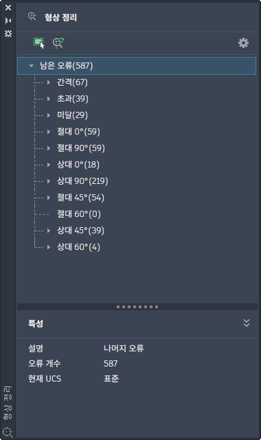 트리 뷰에 구성된 현재 도면 또는 선택 항목에서 발견된 모든 오류를 표시합니다. 오류 유형에는 간격, 초과, 미달, 절대 각도 및 상대 각도가 포함될 수 있습니다.
