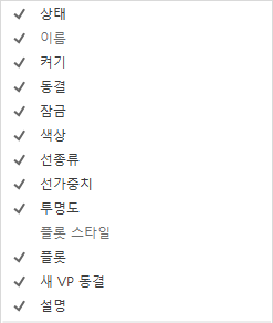 전체 열을 이름별로 나열합니다. 선택 표식은 열이 표시에 포함됨을 나타냅니다. 열 이름을 클릭하면 해당 열을 표시하거나 숨길 수 있습니다. VP 동결, VP 색상, VP 선종류, VP 선가중치 및 VP 플롯 스타일은 배치 뷰포트가 활성화된 경우에만 사용할 수 있습니다.
