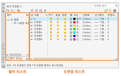 상자에 문자를 입력하면 이름별로 도면층 리스트를 필터링합니다.
