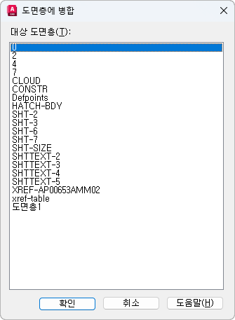 이 대화상자는 선택한 도면층이 병합될 도면층을 지정합니다. 병합된 도면층은 이 대화상자에서 선택한 도면층의 특성을 상속합니다.