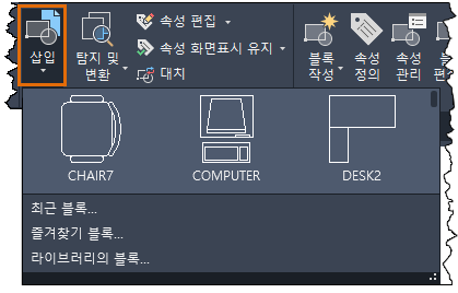 블록 팔레트를 열지 않고, 홈 탭, 블록 패널에서 삽입을 클릭하여 현재 도면에 블록 갤러리를 표시합니다. 다른 두 옵션인 최근 블록 및 라이브러리의 블록은 블록 팔레트를 해당 탭에 엽니다.