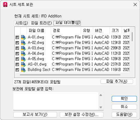 전송 패키지에 포함할 시트를 시트 순서와 하위 세트 구조에 따라 나열합니다. 시트 세트는 시트 세트 관리자에서 열어야 합니다. 최상위 시트 세트 노드를 마우스 오른쪽 버튼으로 클릭하면 표시되는 바로 가기 메뉴에서 보관을 선택하거나, 명령 프롬프트에서 ARCHIVE를 입력할 수 있습니다.