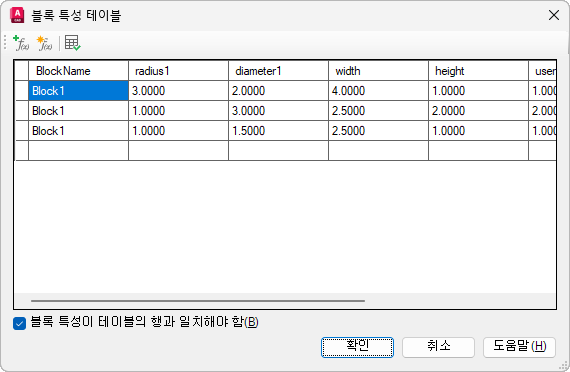 블록 특성 테이블 대화상자의 그리드에서 Shift 키를 누른 채로 Enter 키를 눌러 여러 줄 속성 값에 새 줄을 추가할 수 있습니다.
