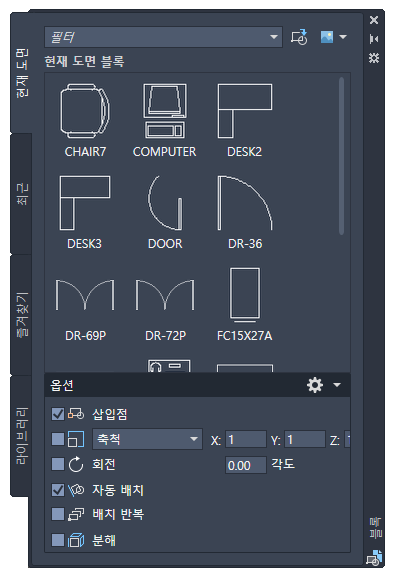 | 폴더의 도면 - 도면 파일을 파일 폴더에서 블록으로 현재 도면에 끌어 놓을 수 있습니다. |