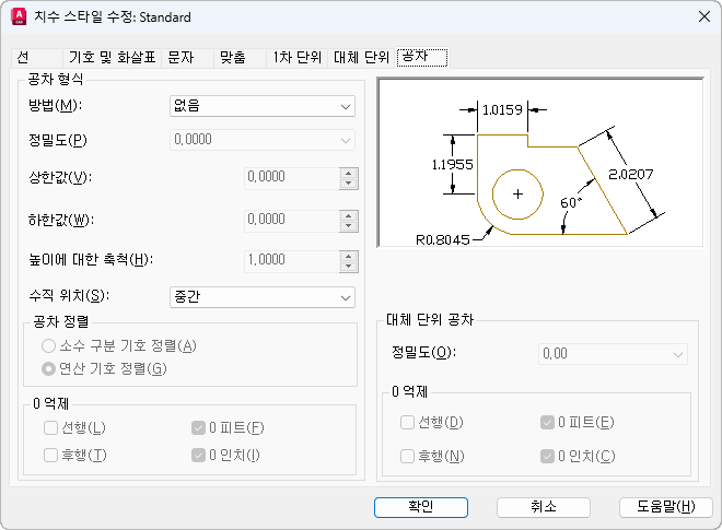 공차를 계산하기 위한 방법을 설정합니다. (DIMTOL 시스템 변수)