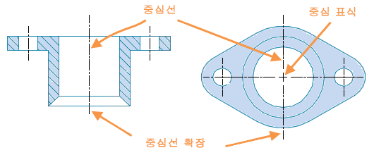 중심 표식과 중심선은 대칭 축 및 구멍의 중심에 대한 치수기입 참조입니다.