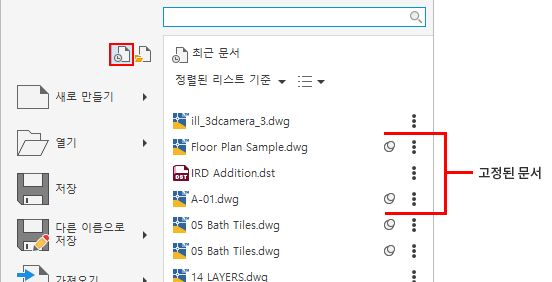 파일 이름 오른쪽의 누름 핀 버튼을 클릭하면 나중에 파일을 추가로 저장해도 해당 파일을 리스트에 계속 포함해 둘 수 있습니다. 그러면 해당 파일은 누름 핀 버튼을 끌 때까지 리스트 맨 아래에 표시됩니다.