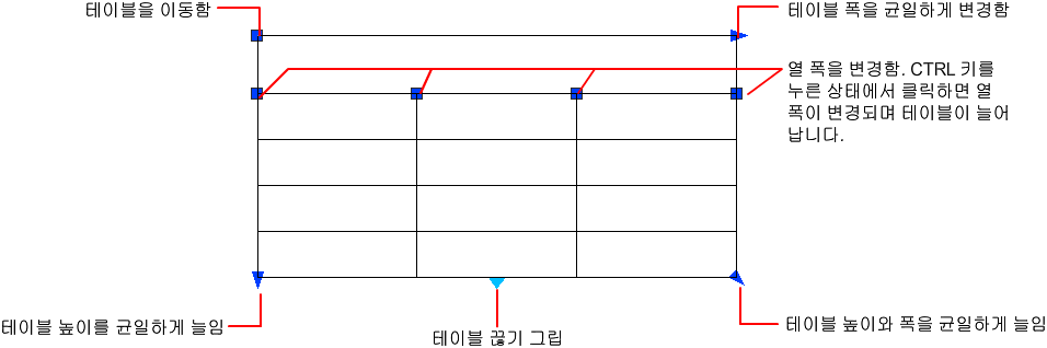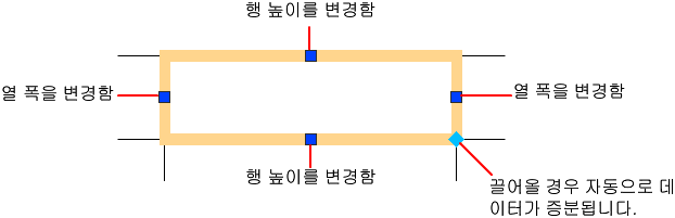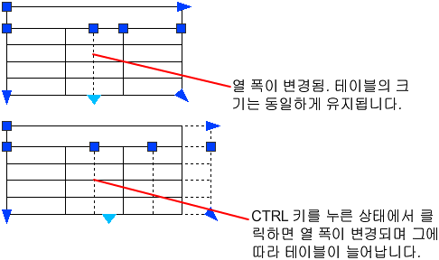 테이블의 높이나 폭을 변경할 때, 사용자가 선택한 그립에 인접한 행 또는 열만 변경됩니다. 테이블은 높이 또는 폭을 유지합니다. 테이블의 크기를 편집 중인 행 또는 열의 크기에 비례하게 변경하려면, Ctrl 키를 누른 상태에서 열 그립을 사용합니다.