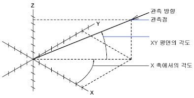 -VPOINT를 사용하여 뷰를 회전할 수 있습니다. 다음 그림에서는 WCS의 X축 및 XY 평면에 상대적인 두 각도로 정의된 뷰를 보여줍니다.