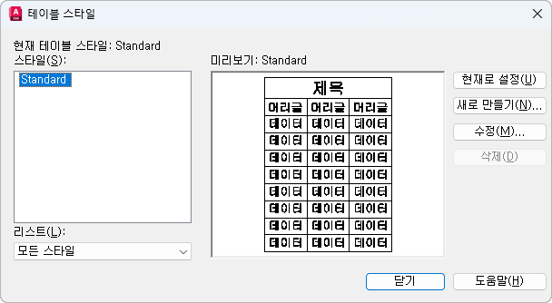 스타일 리스트에서 선택된 테이블 스타일을 삭제합니다. 도면에서 사용 중인 스타일을 삭제할 수 없습니다.
