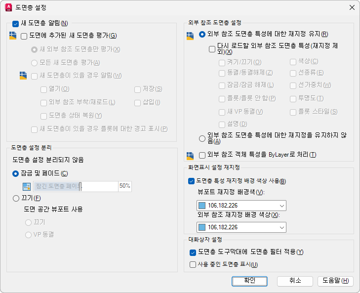 새 도면층에 대해 알림이 수행되는 시기, 일부 도면층이 격리된 경우의 도면층 동작, 도면층 필터가 도면층 도구막대에 적용되는지 여부, 그리고 도면층 특성 관리자에서 뷰포트 재지정의 배경 색상을 조정합니다.