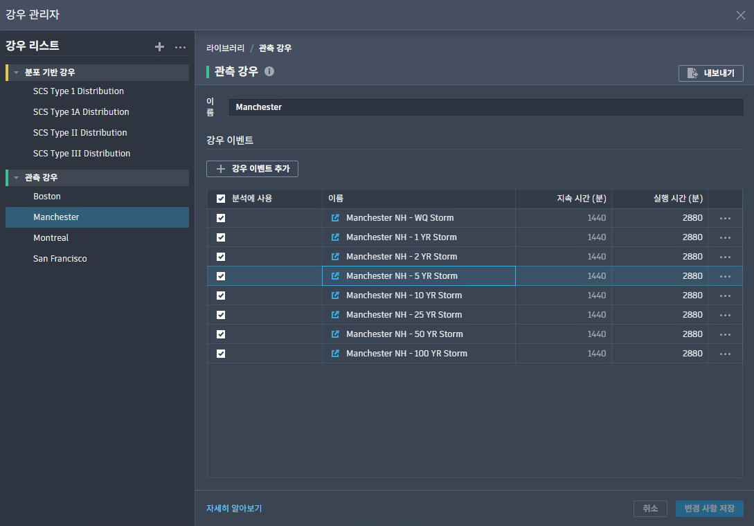 강우 관리자는 소프트웨어에서 사용되는 모든 강우 데이터를 작성, 편집 및 관리할 수 있는 중앙 집중식 공간을 제공합니다. 여기에는 미리 정의된 강우 패턴과 사용자가 작성한 사용자 지정 이벤트가 모두 포함되어 있습니다. 강우 데이터를 공통 세트로 구성하면 다양한 분석에서 쉽게 액세스하고 일관되게 적용하도록 할 수 있습니다.