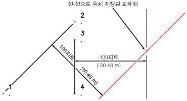 교차로는 오른쪽으로 간격띄우기를 100피트로 하여 점 1과 2 사이에 그려진 선과 왼쪽으로 간격띄우기를 100피트로 하여 점 3과 4 사이에 그려진 선 사이에 배치됩니다.