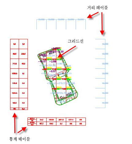 - 통계 테이블: 총 절토 및 성토 값과 그리드의 각 행 및 열에 대한 총계를 표시합니다.