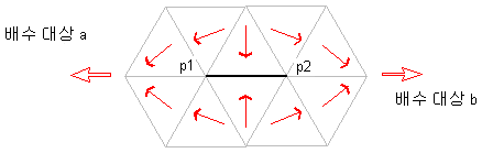 다음 그림과 같이 이 노치로 흐르는 물이 p1과 p2에서 형성되며 배수 대상 “a” 또는 배수 대상 “b”로 배수될 수 있기 때문에 이러한 유역 유형을 다중 배수 노치라고 합니다.