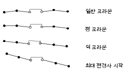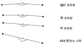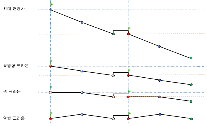 다음 그림은 코리더 유형으로 분할된 도로를 보여 주며 각 측면에 크라운이 있는 횡단 쉐이프가 있습니다. 편경사 중에 도로에서 역방향 크라운 제거가 수행됩니다.