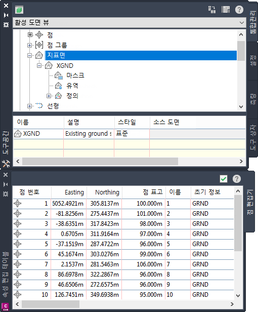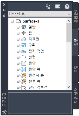 도구공간 윈도우는 최대 4개의 탭, 통합관리, 설정, 측량 및 도구 상자를 표시할 수 있습니다. 속성 편집 테이블 윈도우에 두 개 이상의 뷰가 활성화되어 있는 경우 윈도우에는 명명된 탭이 나타납니다.