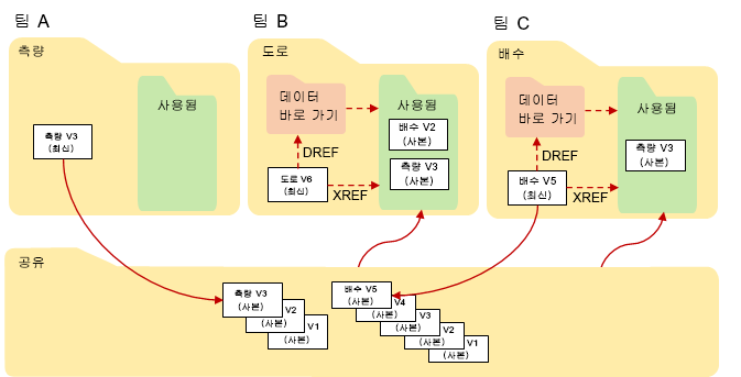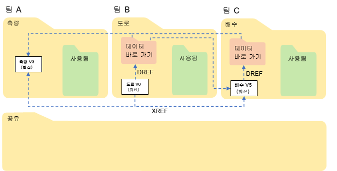 - 작업 폴더에서 다른 팀의 Civil 3D 객체를 DREF합니다.