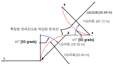 | 반지름 | 중심점에서 원곡선까지의 거리입니다. 이 값을 현재 측량 데이터베이스 거리 단위로 입력합니다. 음수 반지름을 사용하면 원곡선을 시계 반대 방향(왼쪽)으로 그릴 수 있습니다. |