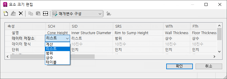 팁: 표준 Microsoft® Windows의 잘라서 붙여넣는 기능(CTRL+C 및 CTRL+V)을 사용하여 다른 요소 집합에서 값을 잘라낸 후 붙여넣을 수 있습니다. 요소 작성기에서 다른 요소를 열어 복사할 크기 매개변수를 선택한 다음 선택한 값을 원하는 요소 매개변수에 붙여넣습니다. Microsoft® Excel에서 값 리스트를 작성하고 추가할 값 리스트를 선택한 다음 해당 값을 원하는 요소 매개변수에 붙여넣을 수도 있습니다.