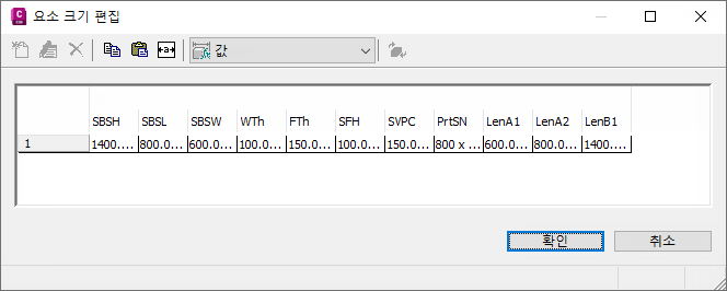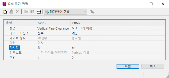 요소 크기 편집 대화상자가 표시되고 선택된 요소에 대해 현재 사용할 수 있는 크기 매개변수가 모두 표시됩니다. 간단한 원통 구조물 요소의 경우 몇 가지 기본 크기 매개변수로 요소 크기 이름(PrtSN) 및 구조물 수직 파이프 이격거리(SVPC) 등이 있습니다.